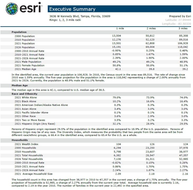 The plaza is located directly off Kennedy Blvd, a main east west artery road into Downtown in an affluent South Tampa submarket. This plaza benefits from high visibility off the main thoroughfare, great access and ample parking. The tenant mix includes a diverse range of internet resistant service-based retail uses that have a long track record of operating at the property. This submarket benefits from very strong demographics including 47,000 households and a median household income of over $68,000 within a 3-mile radius.